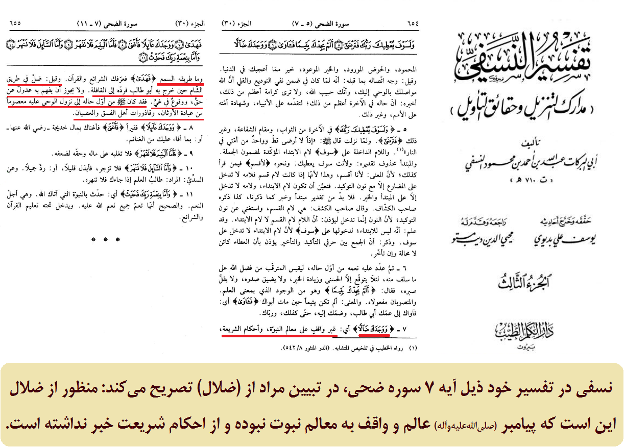 نسفی در تفسیر خود ذیل آیه 7 سوره ضحی، در تبیین مراد از (ضلال) تصریح میکند: منظور از ضلال این است که پیامبر (صلیاللهعلیهوآله) عالم و واقف به معالم نبوت نبوده و از احکام شریعت خبر نداشته است.