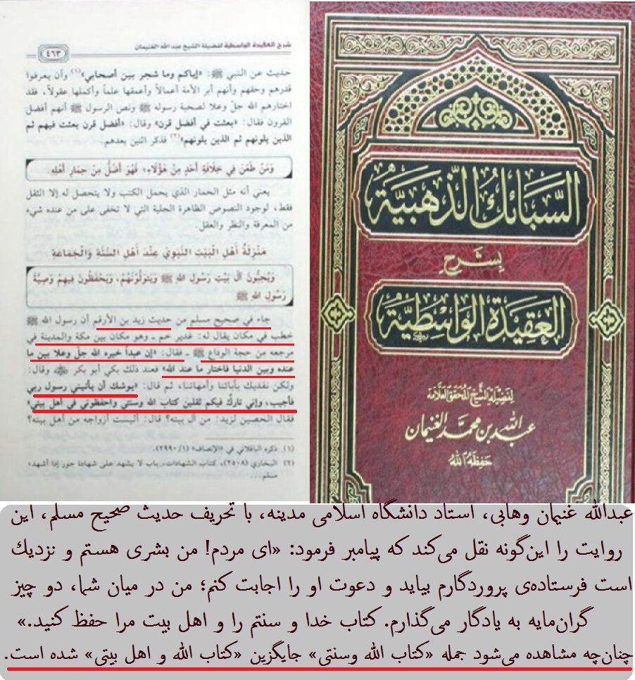 عبدالله غنیمان وهابی، استاد دانشگاه اسلامی مدینه، با تحریف حدیث صحیح مسلم، این روایت را اینگونه نقل میکند که پیامبر فرمود: «ای مردم! من بشری هستم و نزديك است فرستادهی پروردگارم بيايد و دعوت او را اجابت كنم؛ من در ميان شما، دو چيز گرانمايه به يادگار میگذارم. کتاب خدا و سنتم را و اهل بیت مرا حفظ کنید.»