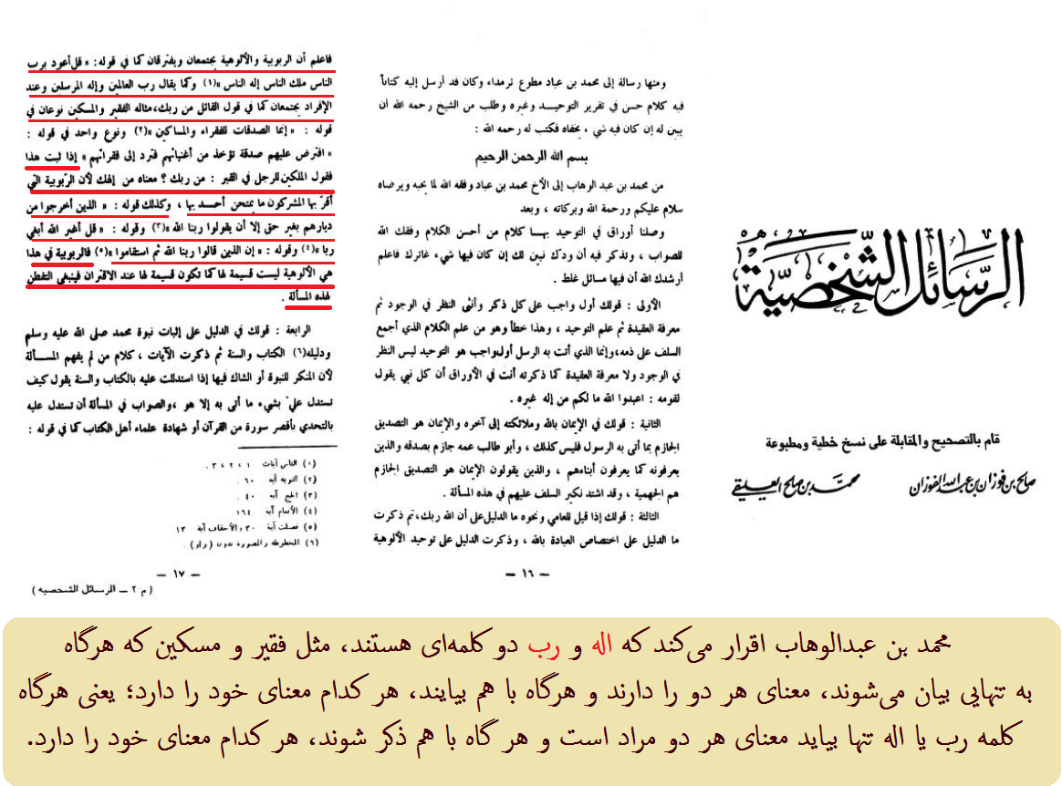 محمد بن عبدالوهاب اقرار میکند که اله و رب دو کلمهای هستند، مثل فقیر و مسکین که هر گاه به تنهایی بیان میشوند، معنای هر دو را دارند و هرگاه با هم بیایند، هر کدام معنای خود را دارد؛ یعنی هر گاه کلمه رب یا اله تنها بیاید معنای هر دو مراد است و هر گاه با هم ذکر شوند، هر کدام معنای خود را دارد.
