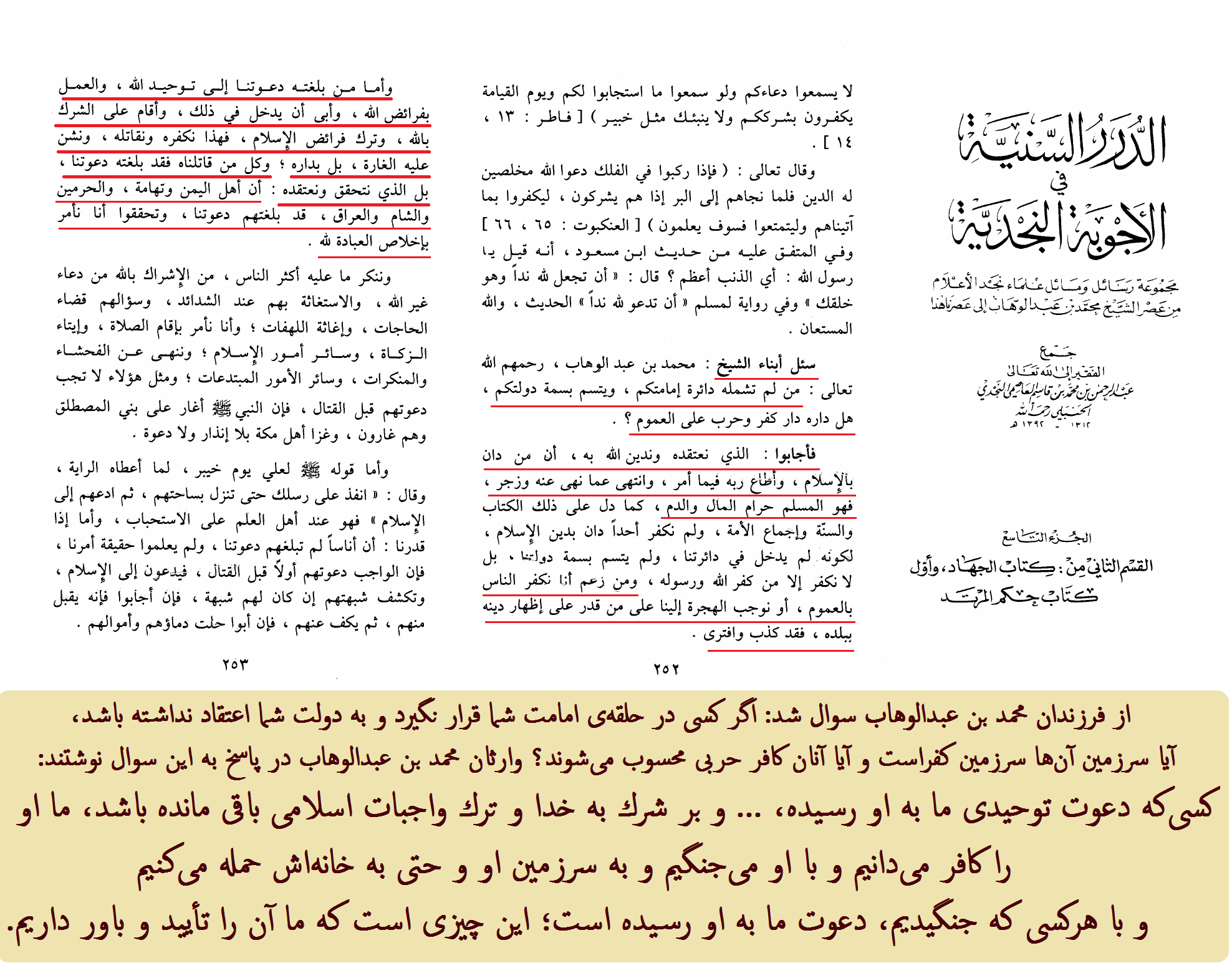 از فرزندان محمد بن عبدالوهاب سوال شد: اگر کسی در حلقهی امامت شما قرار نگیرد و به دولت شما اعتقاد نداشته باشد، آیا سرزمین آنها سرزمین کفراست و آیا آنان کافر حربی محسوب میشوند؟ وارثان محمد بن عبدالوهاب در پاسخ به این سوال نوشتند: كسیكه دعوت توحیدی ما به او رسیده، ... و بر شرك به خدا و ترك واجبات اسلامی باقی مانده باشد، ما او را كافر میدانیم و با او میجنگیم و به سرزمین او و حتی به خانهاش حمله میكنیم و با هرکسی که جنگیدیم، دعوت ما به او رسیده است؛ این چیزی است که ما آن را تأیید و باور داریم.