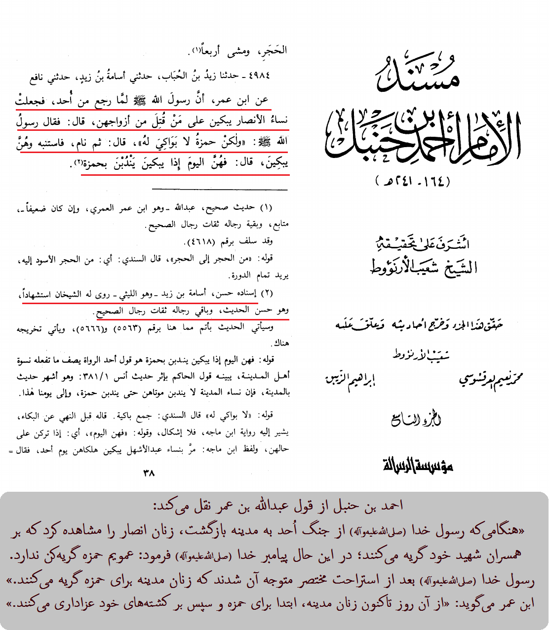 احمد بن حنبل از قول عبدالله بن عمر نقل میکند: «هنگامیکه رسول خدا (صلیاللهعلیهوآله) از جنگ اُحد به مدینه بازگشت، زنان انصار را مشاهده کرد كه بر همسران شهید خود گريه میكنند؛ در این حال پیامبر خدا (صلیاللهعلیهوآله) فرمود: عمویم حمزه گريهكن ندارد. رسول خدا (صلیاللهعلیهوآله) بعد از استراحت مختصر متوجه آن شدند كه زنان مدینه برای حمزه گريه میكنند.»