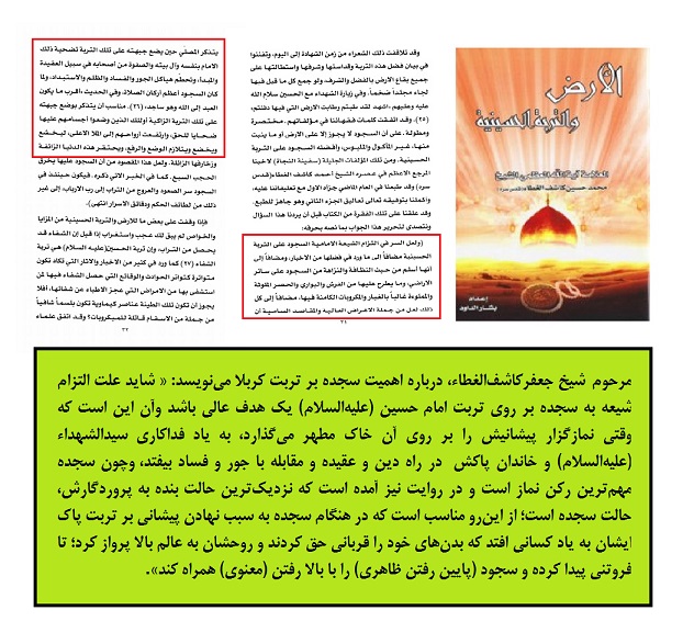 مرحوم شیخ جعفرکاشفالغطاء، درباره اهمیت سجده بر تربت کربلا مینویسد: