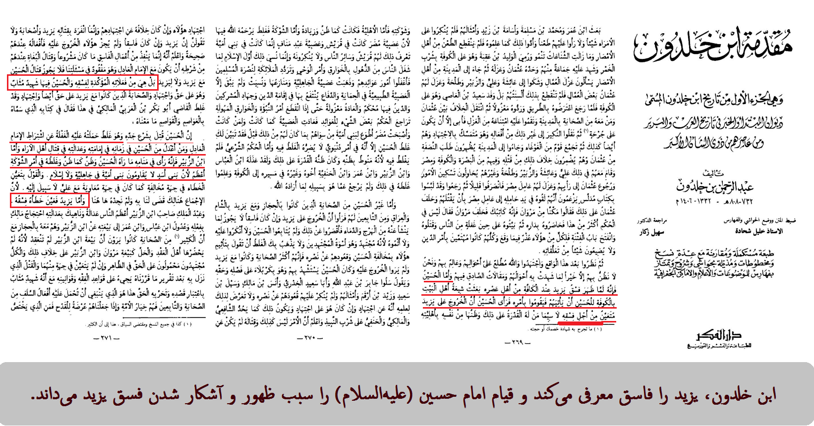 ابن خلدون، یزید را فاسق معرفی میکند و قیام امام حسین (علیهالسلام) را سبب ظهور و آشکار شدن فسق یزید میداند.