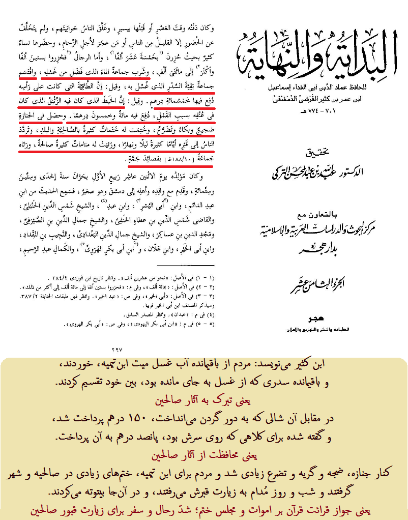 ابن کثیر مینویسد: مردم از باقیمانده آب غسل میت ابنتیمیه، خوردند، و باقیمانده سدری که از غسل به جای مانده بود، بین خود تقسیم کردند.