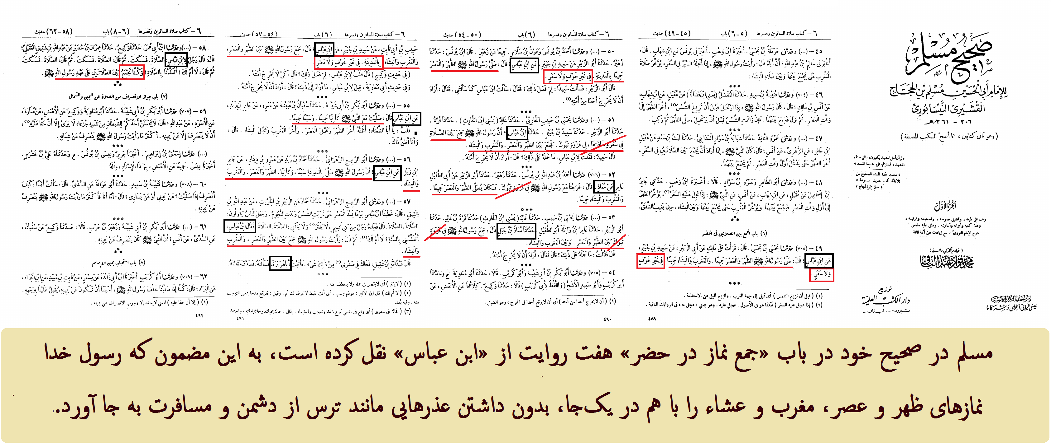 مسلم در صحیح خود در باب «جمع نماز در حضر» هفت روایت از «ابن عباس» نقل کرده است، به این مضمون که رسول خدا نمازهای ظهر و عصر، مغرب و عشاء را با هم در یکجا، بدون داشتن عذرهایی مانند ترس از دشمن و مسافرت به جا آورد.