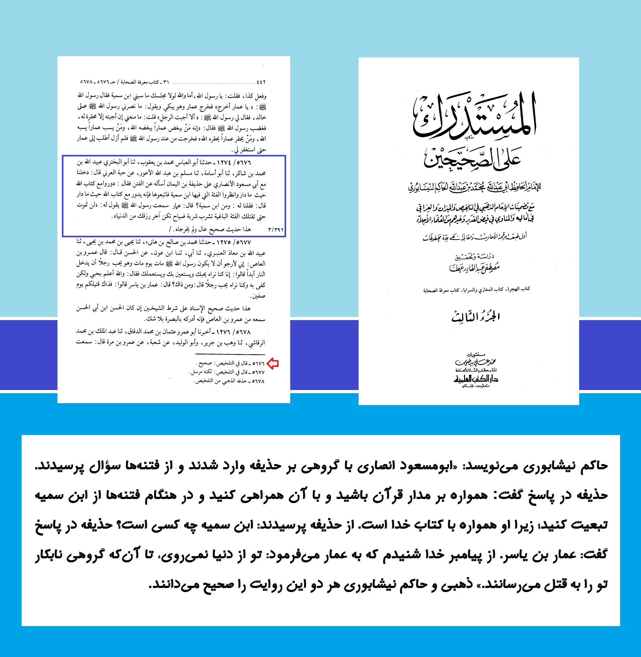 حاکم نیشابوری، محدث نام آشنای اهل سنت مینویسد: «ابومسعود انصاری با گروهی بر حذیفه وارد شدند و از فتنهها سؤال پرسیدند. حذیفه در پاسخ گفت: همواره بر مدار قرآن باشید و با آن همراهی کنید و در هنگام فتنهها از ابن سمیه تبعیت کنید؛ زیرا او همواره با کتاب خدا است. از حذیفه پرسیدند: ابن سمیه چه کسی است؟ حذیفه در پاسخ گفت: عمار بن یاسر. از پیامبر خدا شنیدم که به عمار میفرمود: تو از دنیا نمیروی، تا آنکه گروهی نابكار تو را به قتل میرسانند.»