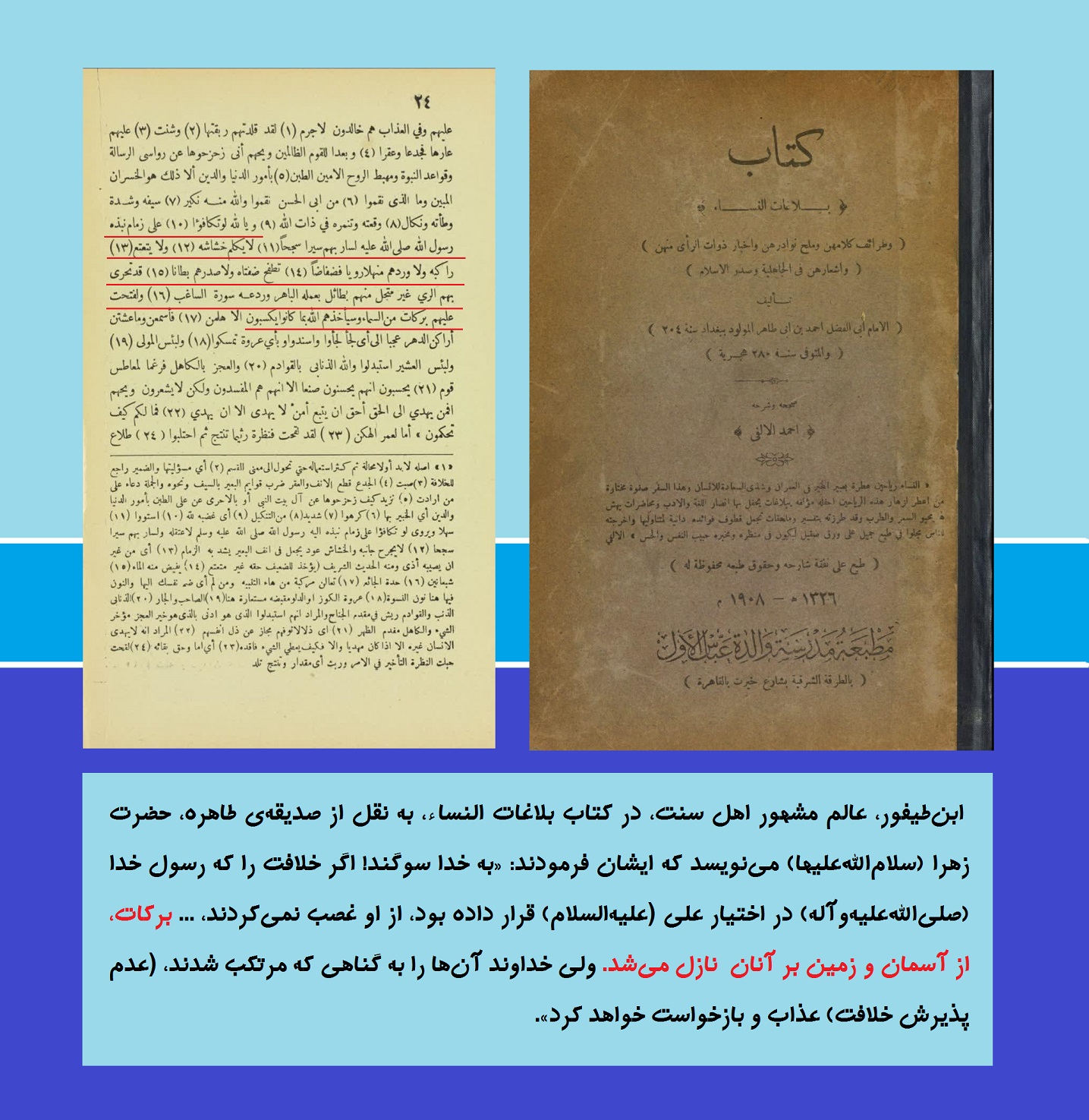 ابنطیفور، عالم مشهور اهل سنت، در کتاب بلاغات النساء، به نقل از صدیقهی طاهره، حضرت زهرا (سلاماللهعلیها) مینویسد که ایشان فرمودند: «به خدا سوگند! اگر خلافت را كه رسول خدا (صلیاللهعلیهوآله) در اختيار على (علیهالسلام) قرار داده بود، از او غصب نمیکردند، ... برکات، از آسمان و زمين بر آنان نازل میشد؛ ولی خداوند آنها را به گناهی که مرتكب شدند، )عدم پذیرش خلافت) عذاب و بازخواست خواهد کرد.»