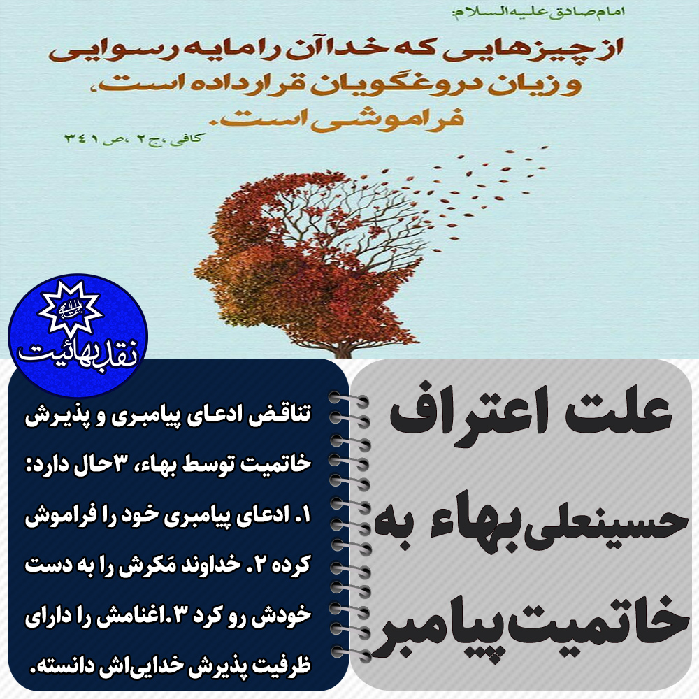 حسینعلی نوری، از یکسو به خاتمیت پیامبر اسلام اعتراف و از سویی دیگر، ادعای پیامبری داشته است! اما حل این تناقض، از سه حال خارج نیست: 1. او ادعای پیامبری خود را فراموش کرده 2. اعتراف او، مصداق وعدهی الهی به آشکارسازی مَکر کفار، به وسیلهی خودشان است 3. به این نکته پی برده که اغنام او، ظرفیت پذیرش خداییاش را نیز دارند.