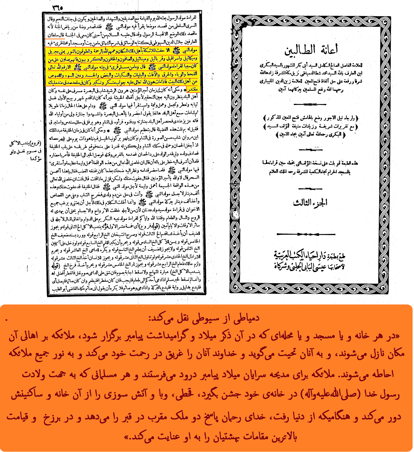 دمیاطی از سیوطی نقل میکند: «در هر خانه و یا مسجد و یا محلهای که در آن ذکر میلاد و گرامیداشت پیامبر برگزار شود، ملائکه بر اهالی آن مکان نازل میشوند، و به آنان تحیت میگوید و خداوند آنان را غریق در رحمت خود میکند و به نور جمیع ملائکه احاطه میشوند. ملائکه برای مدیحه سرایان میلاد پیامبر درود میفرستند و هر مسلمانی که به جهت ولادت رسول خدا (صلیاللهعلیهوآله) در خانهی خود جشن بگیرد، قحطی، وبا و آتش سوزی را از آن خانه و ساکنینش دور میکند و هنگامیکه از دنیا رفت، خدای رحمان پاسخ دو ملک مقرب در قبر را میدهد و در برزخ و قیامت بالاترین مقامات بهشتیان را به او عنایت میکند.»