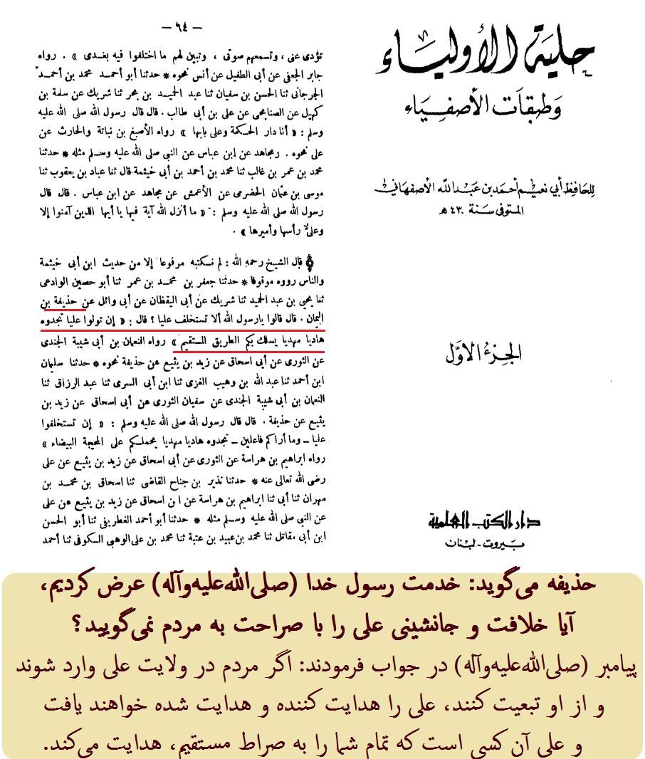 حذیفه میگوید: خدمت رسول خدا (صلیاللهعلیهوآله) عرض کردیم، آیا خلافت و جانشینی علی را با صراحت به مردم نمیگویید؟ پیامبر (صلیاللهعلیهوآله) در جواب فرمودند: اگر مردم در ولایت علی وارد شوند و از او تبعیت کنند، علی را هدایت کننده و هدایت شده خواهند یافت و علی آن کسی است که تمام شما را به صراط مستقیم، هدایت میکند.