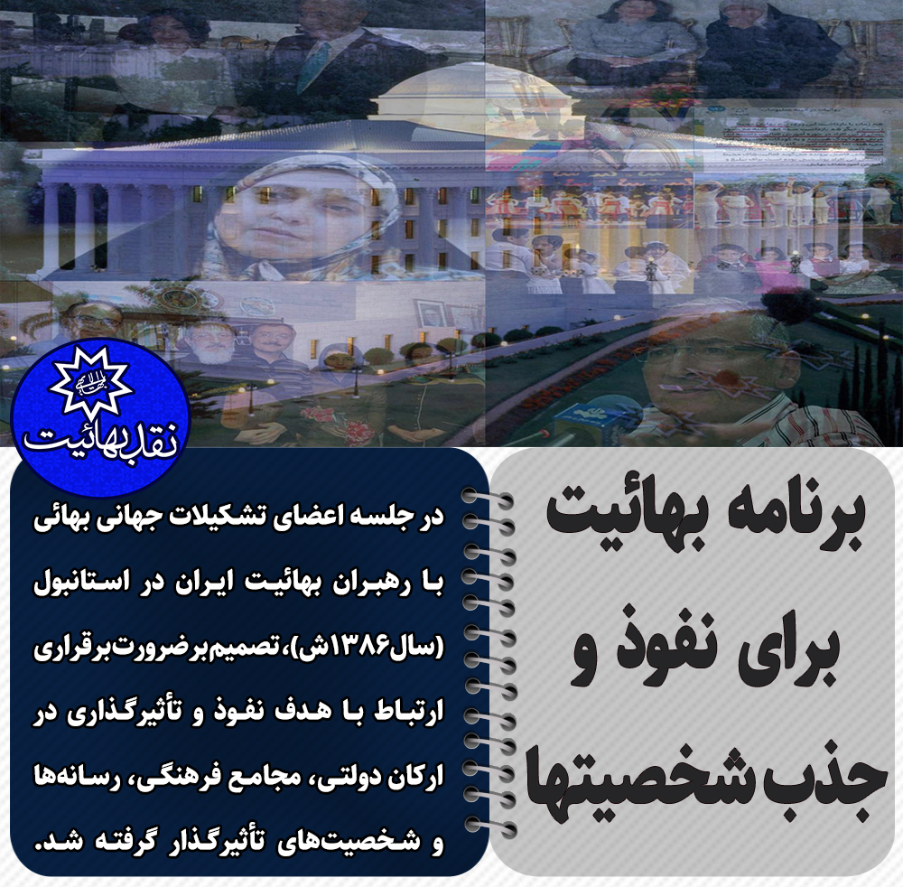 از این رو در جلسه اعضای تشکیلات جهانی بهائی با رهبران بهائی ایران در استانبول (سال 1386 ش)، بنابر: ضرورت برقراری ارتباط با هدف نفوذ و تأثیرگذاری در ارکان دولتی، مجامع فرهنگی، رسانه‌ها و شخصیت‌های تأثیرگذار نهاده شد.