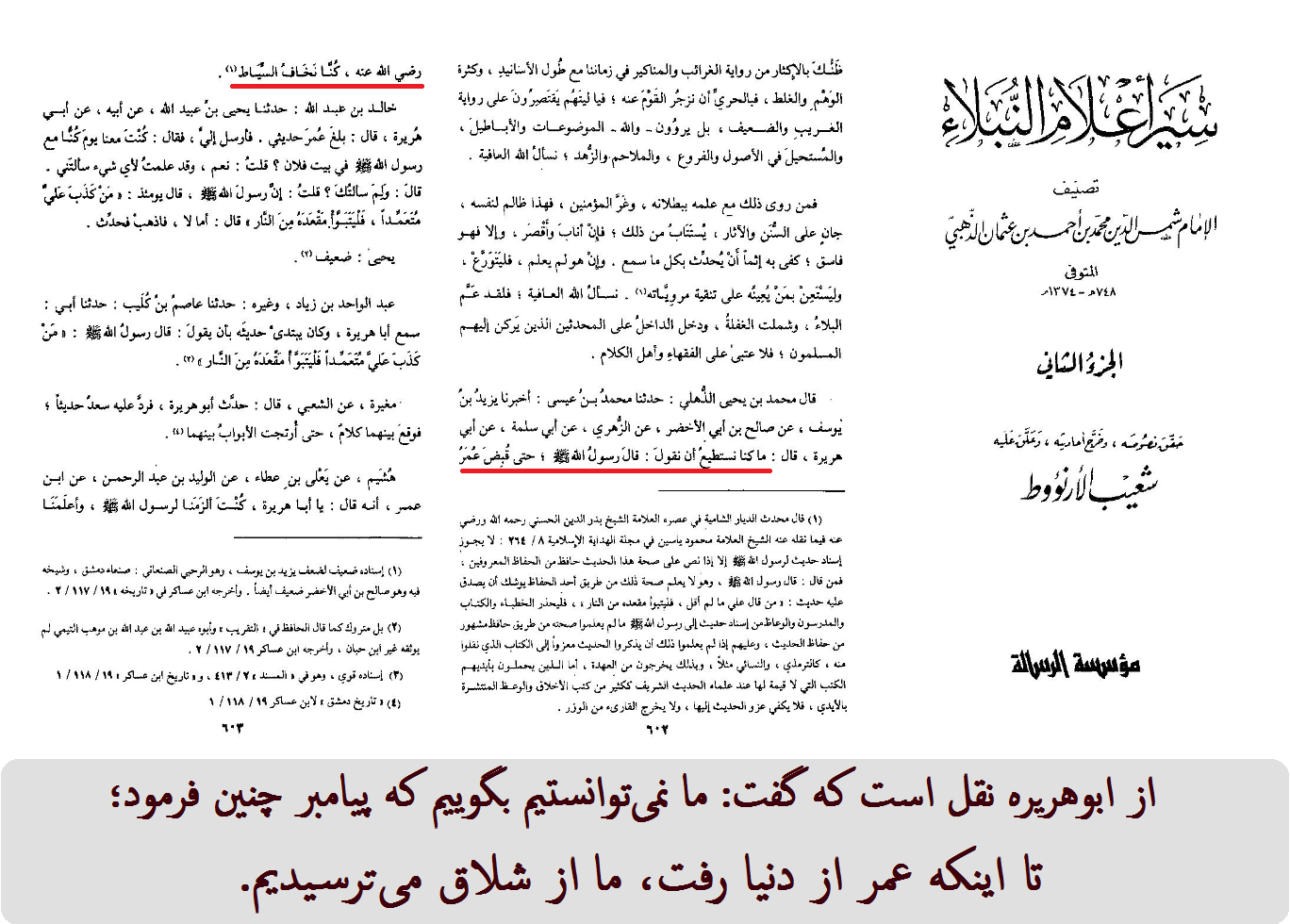 از ابوهریره نقل است که گفت: ما نمیتوانستیم بگوییم که پیامبر چنین فرمود؛ تا اینکه عمر از دنیا رفت، ما از شلاق میترسیدیم.
