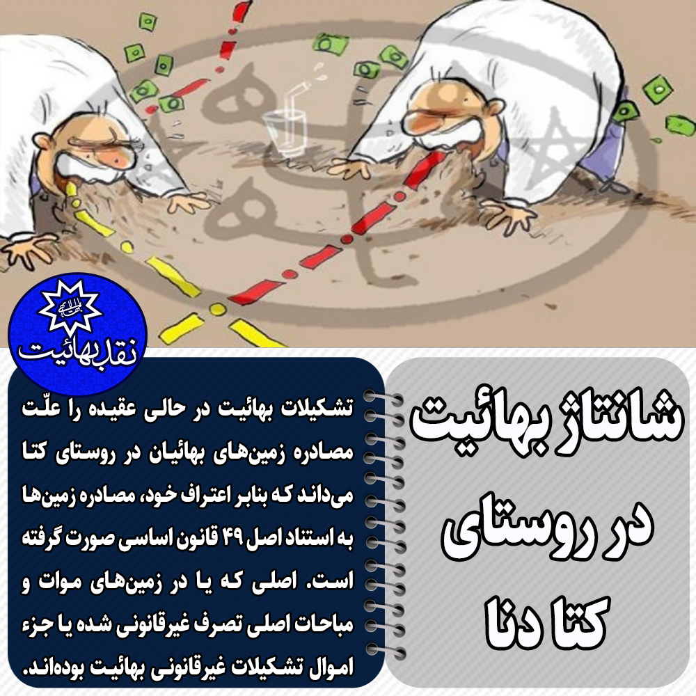 تشکیلات بهائیت در جریان سازی اخیر خود علیه جمهوری اسلامی، مدعی مصادره زمینهای کشاورزی بهائیان روستای کتا دنا به جرم عقیده شده است. این در حالی است که بنابر اعتراف تشکیلات بهائی، مصادره زمینها به استناد اصل 49 قانون اساسی کشور بوده است. اصلی که یا بهائیان در زمینهای موات و مباحات اصلی تصرف کرده یا جزء اموال تشکیلات غیرقانونی بهائیت بوده است.