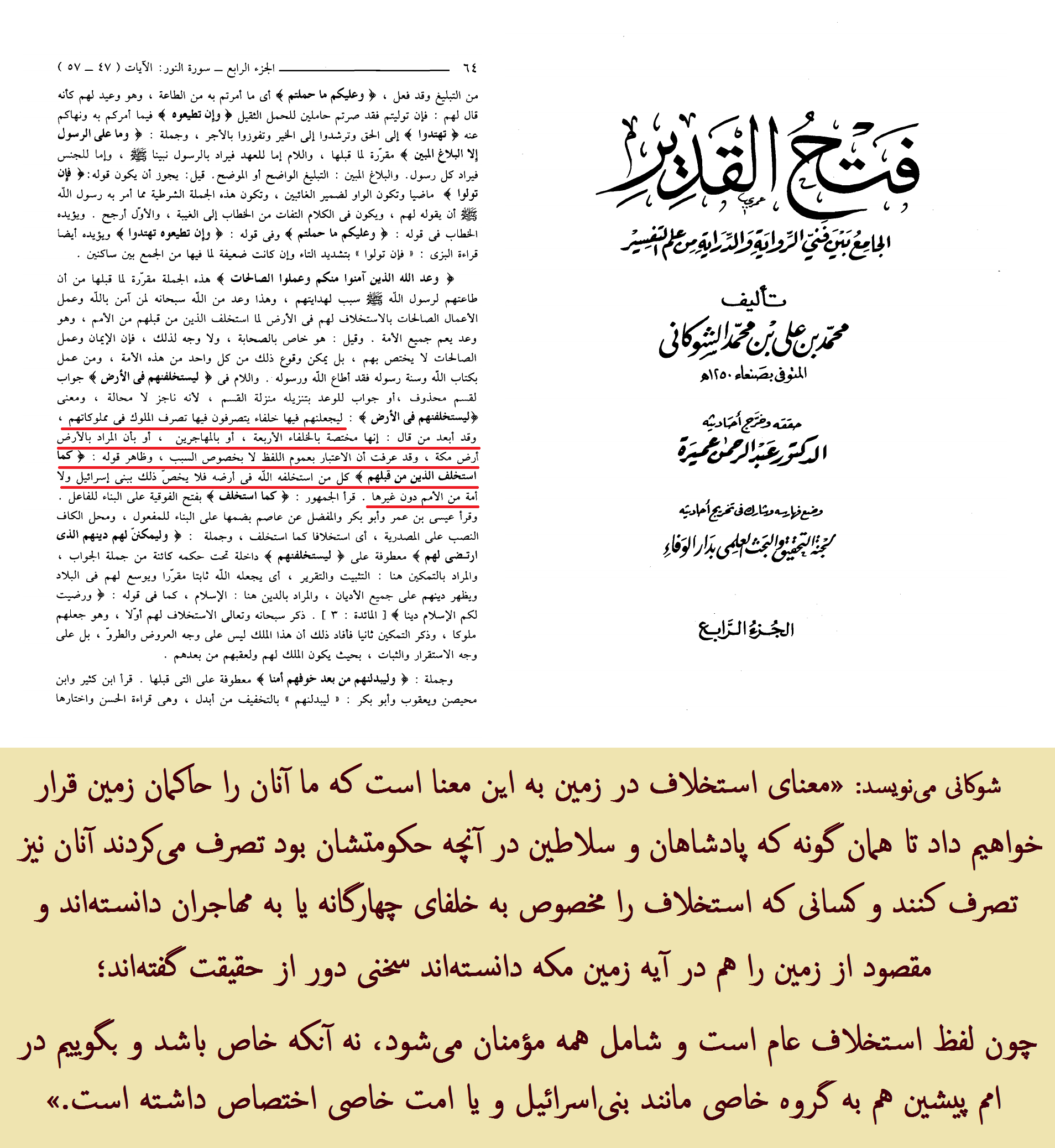 شوکانی مینویسد: «معنای استخلاف در زمین به این معنا است که ما آنان را حاکمان زمین قرار خواهیم داد تا همان گونه که پادشاهان و سلاطین در آنچه حکومتشان بود تصرف میکردند آنان نیز تصرف کنند و کسانی که استخلاف را مخصوص به خلفای چهارگانه یا به مهاجران دانستهاند و مقصود از زمین را هم در آیه، زمین مکه دانستهاند، سخنی دور از حقیقت گفتهاند؛ چون لفظ استخلاف، عام است و شامل همه مؤمنان میشود، نه آنکه خاص باشد و بگوییم در امم پیشین هم به گروه خاصی مانند بنیاسرائیل و یا امت خاصی اختصاص داشته است.»
