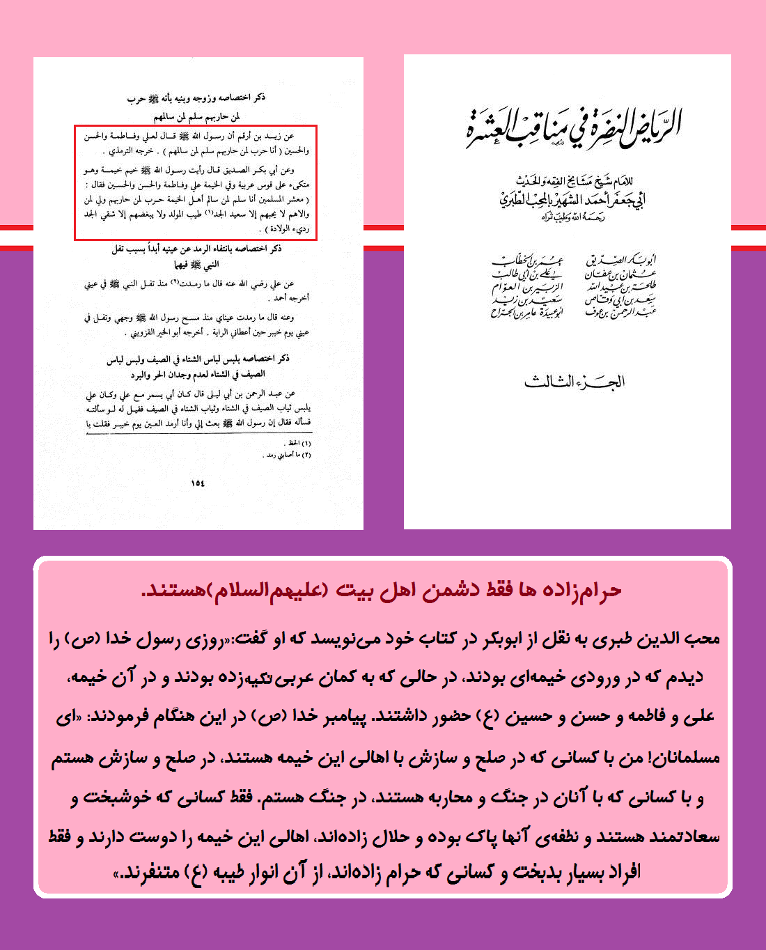 «ای مسلمانان! من با کسانی که در صلح و سازش با اهالی این خیمه هستند، در صلح و سازش هستم و با کسانی که با آنان در جنگ و محاربه هستند، در جنگ هستم. فقط کسانی که خوشبخت و سعادتمند هستند و نطفهی آنها پاک بوده و حلال زادهاند، اهالی این خیمه را دوست دارند و فقط افراد بسیار بدبخت و کسانی که حرام زادهاند، از آن انوار طیبه (علیهمالسلام) متنفرند.»