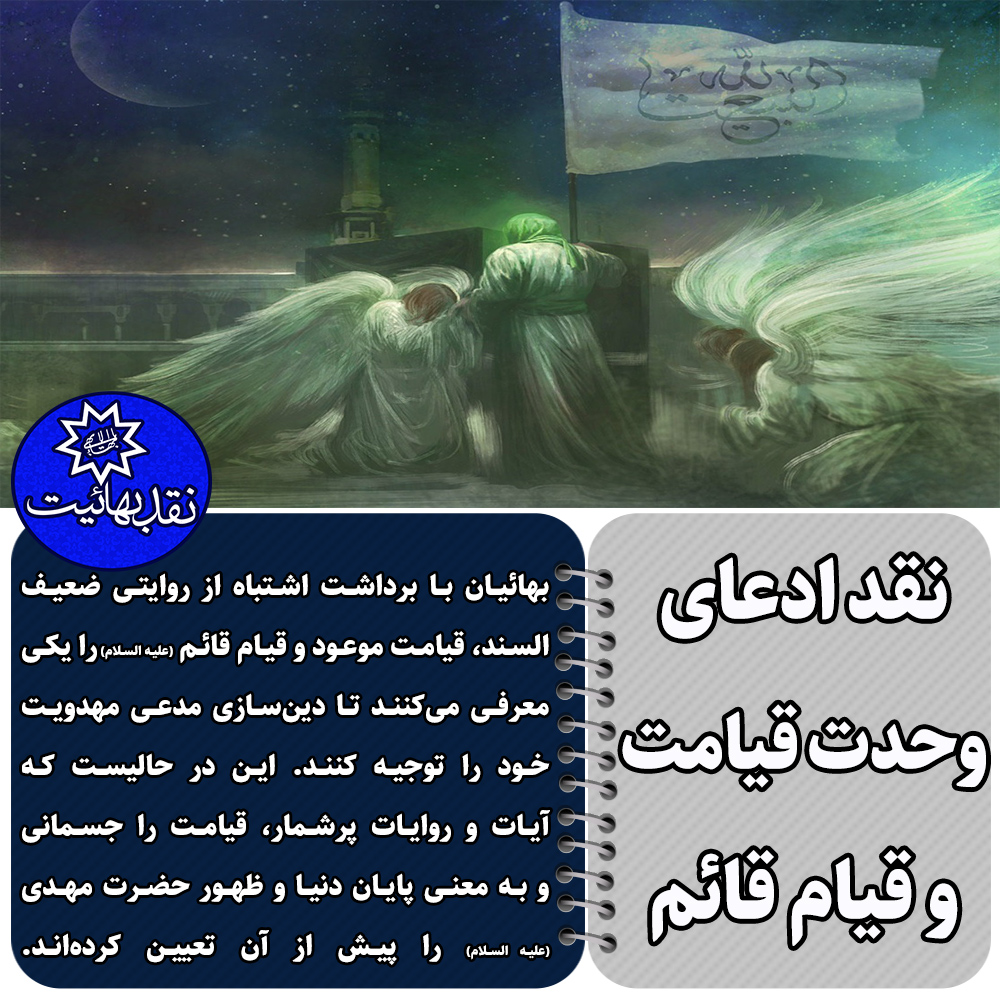 بهائیان با برداشت اشتباه از روایتی ضعیف السند، قیامت موعود و قیام قائم (علیه السلام) را یکی معرفی میکنند تا دین سازی مدعی مهدویت خود را توجیه کنند. این در حالیست که آیات و روایات پرشمار، قیامت را جسمانی و به معنی پایان دنیا و ظهور حضرت مهدی (علیه السلام) را پیش از آن تعیین کردهاند.