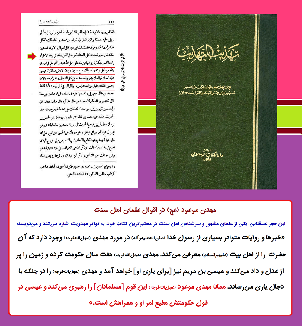 ابن حجر عسقلانی، از علمای مشهور و سرشناس اهل سنت در معتبرترین کتاب خود، به تواتر مهدویت اشاره می کند و می نویسد: «خبرها و روایات متواتری از رسول خدا (صلیاللهعلیهوآله) در مورد مهدی (عجلاللهفرجه) وجود دارد که آن حضرت را از اهل بیت (علیهمالسلام) معرفی می کند. مهدی (عجلاللهفرجه) هفت سال حکومت کرده و زمین را پر از عدل و داد می کند و عیسی بن مریم نیز [برای یاری او] خواهد آمد و مهدی (عجلاللهفرجه) را در جنگ با دجال یاری میرساند. همانا مهدی موعود (عجلاللهفرجه) این قوم [مسلمانان] را رهبری میکند و عیسی در طول حکومتش مطیع امر او و همراهش است.»