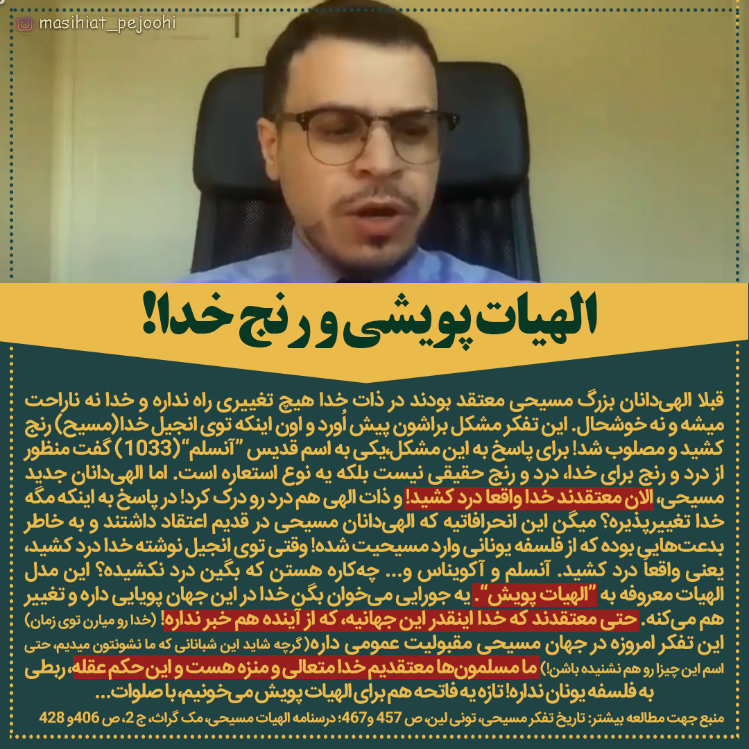 در دروان معاصر الهی دانان مسیحی معتقدند خدا انفعال پذیر بوده، لذا حقیقتا رنج می کشد. به این نوع، الهیات، الهیات پویشی گفته می شود. ما مسلمانان معتقدیم خداوند، متعال و منزه است.