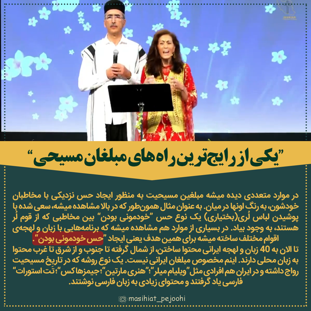 یکی از روش های رایج در تبلیغ مسیحیت، پوشش های محلی است که مبلغین مسیحی از آن استفاده می کنند. هدف از این روش ایجاد حس خودی بودن در مخاطب است. در کلیپ فوق نمونه ای از کشیش مسیحی که لباس لری بختیاری بر تن کرده مشاهده می شود.