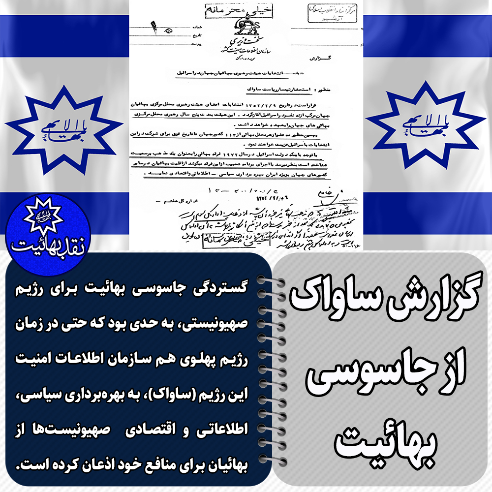 گستردگی جاسوسی بهائیت برای رژیم صهیونیستی، به حدی بود که حتی در زمان رژیم پهلوی هم سازمان اطلاعات امنیت این رژیم (ساواک)، به بهره برداری سیاسی، اطلاعاتی و اقتصادی صهیونیست ها از بهائیان برای منافع خود اذعان کرده است.