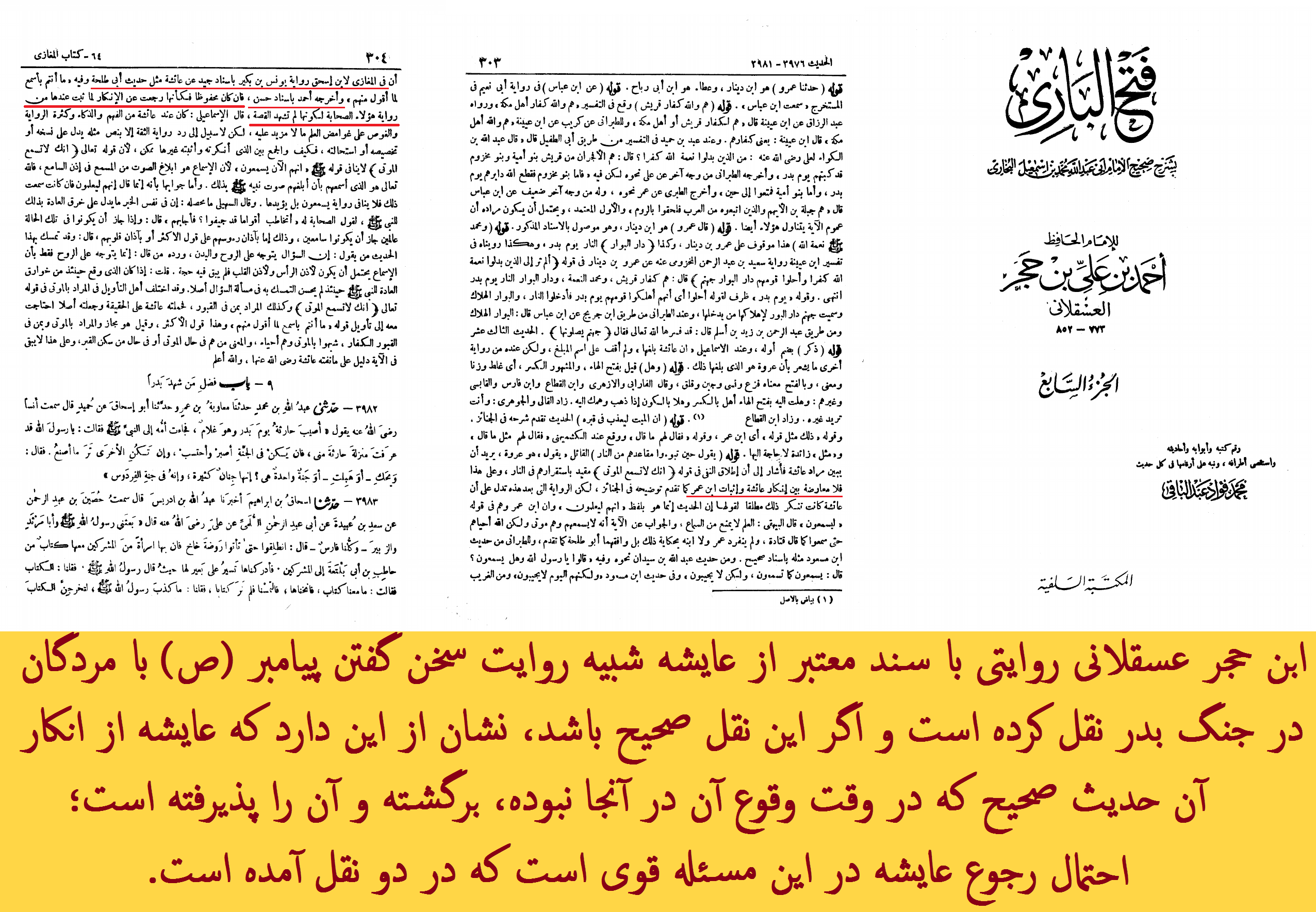 ابن حجر عسقلانی روایتی با سند معتبر از عایشه شبیه روایت سخن گفتن پيامبر (صلىاللهعليهوآله) با مردگان در جنگ بدر نقل کرده است و اگر این نقل صحیح باشد، نشان از این دارد که عایشه از انکار آن حدیث صحیح که در وقت وقوع آن در آنجا نبوده، برگشته و آن را پذیرفته است؛ احتمال رجوع عایشه در این مسئله قوی است که در دو نقل آمده است.