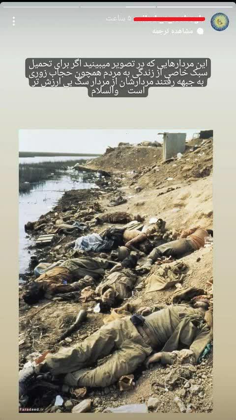 پایگاه جامع فرق، ادیان و مذاهب_ یکی از مبلّغان تشکیلات بهائیت در اقتدا به پیشوای خود عبدالبهاء [1] ضمن مقایسه پیکرهای مطهر شهدای هشت سال دفاع مقدس با مردار سگ، این گلگون بدن ها را در صورت داشتن انگیزه ترویج حجاب و عفاف در جامعه، پست تر از مردار سگ دانست: «این مردارهایی که در تصویر می بینید اگر برای تحمیل سبک خاصی از زندگی به مردم همچون حجاب زوری به جبهه رفتند، مردارشان از مردار سگ بی ارزش تر است.»[2]