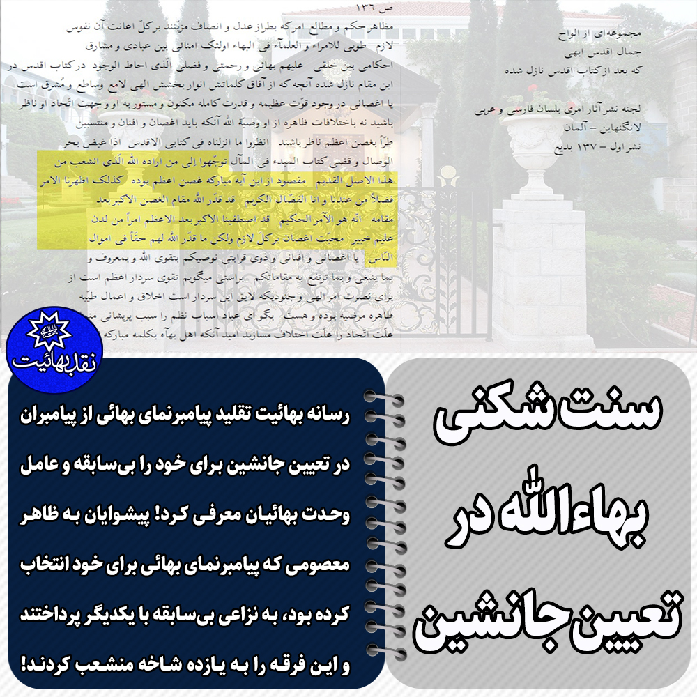 مبلّغین بهائیت تقلید پیامبرنمای بهائی از پیامبران در تعیین جانشین برای خود را بی سابقه و عامل وحدت بهائیان معرفی کردند!