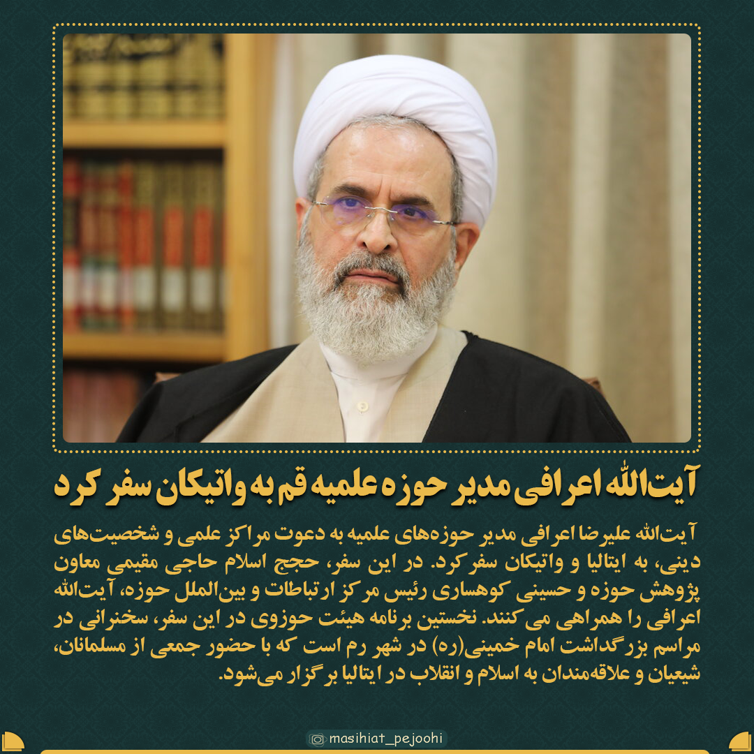 آیت‌الله علیرضا اعرافی مدیر حوزه‌های علمیه به دعوت مراکز علمی و شخصیت‌های دینی، به ایتالیا و واتیکان سفرکرد. در این سفر، حجج اسلام حاجی مقیمی معاون پژوهش حوزه و حسینی کوهساری رئیس مرکز ارتباطات و بین‌الملل حوزه، آیت‌الله اعرافی را همراهی می‌کنند. نخستین برنامه هیئت حوزوی در این سفر، سخنرانی در مراسم بزرگداشت امام خمینی‌(ره) در شهر رم است که با حضور جمعی از مسلمانان، شیعیان و علاقه‌مندان به اسلام و انقلاب در ایتالیا برگزار می‌شود.