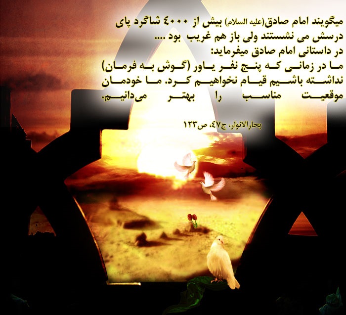 سدیر مىگوید: «به امام صادق (علیهالسلام) گفتم: چه چیز شما را از قیام بازداشته است؟ امام فرمود: مگر چه شده است؟ سدیر گفت: دوستداران، شیعیان و یاوران شما زیاد هستند. به خدا سوگند! اگر امیرالمؤمنین (علیهالسلام) این مقدار یاور داشت، کسى طمع در خلافت نمىکرد. امام فرمود: یاوران من چند نفرند؟ سدیر گفت: صدهزار نفر. امام فرمود: صدهزار! او گفت: بله! بلکه دویست هزار. امام فرمود: دویست هزار! سدیر گفت: آرى! بلکه نصف دنیا. امام سکوت کرد. سدیر میگوید: راهى سرزمین ینبع شدیم. امام در میان راه، چشمش به جوانى افتاد که چند رأس بزغاله را مىچراند. فرمود: اگر تعداد شیعیان من به عدد این بزغالهها بود، از قیام و نهضت باز نمىایستادم. سدیر مىگوید: بزغالهها را شمارش کردم؛ هفده رأس بودند.»[5]