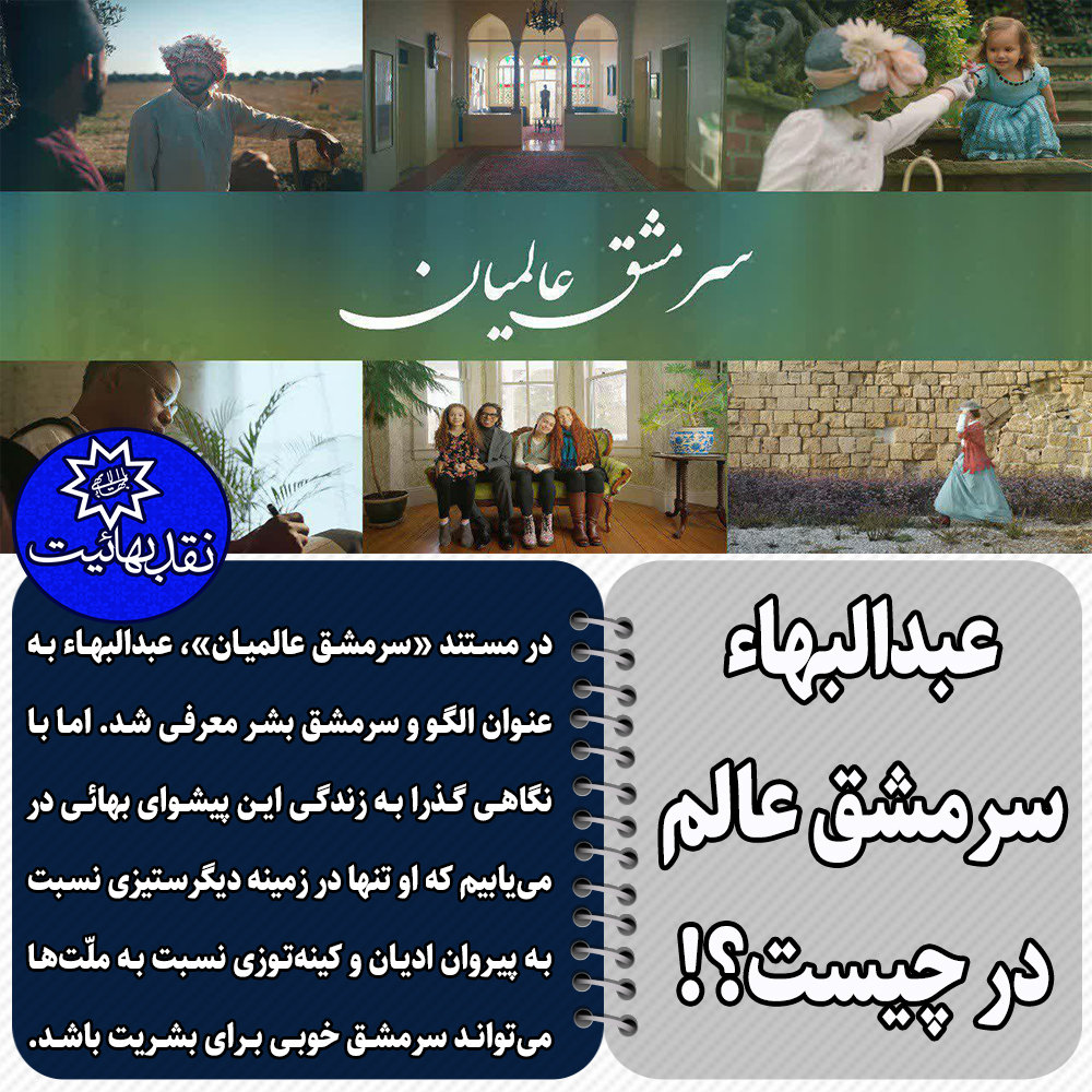 در فیلمی که به سفارش نهاد رهبری بهائیت بیت العدل به مناسبت سالمرگ عبدالبهاء ساخته شد، این پیشوای بهائیت به عنوان الگو و سرمشق عالمیان معرفی شد. اما با نگاهی گذرا به زندگی این پیشوای بهائی در می یابیم که او در زمینه دیگرستیزی نسبت به پیروان ادیان و کینه توزی نسبت به ملت ها می تواند سرمشق خوبی برای بشریت باشد.