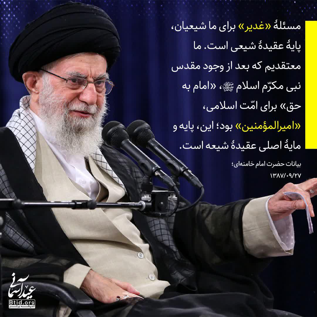 مقام معظم رهبری می فرمایند: «مسئلهی غدیر برای ما شیعیان، پایهی عقیدهی شیعی است. ما معتقدیم که بعد از وجود مقدس نبی مکرم اسلام (صلّی اللَّه و علیه و اله و سلّم) امام بهحق برای امت اسلامی، امیرالمؤمنین بود؛ این، پایه و مایهی اصلی عقیدهی شیعه است.»