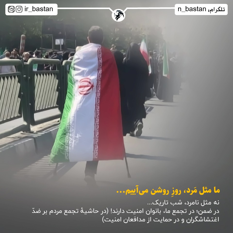 ما مثل مَرد، روزِ روشن میآییم... نه مثل نامرد، شب تاریک ... در ضمن؛ در تجمع ما، بانوان امنیت دارند! (در حاشیۀ تجمع مردم بر ضدّ اغتشاشگران و در حمایت از مدافعان امنیت)