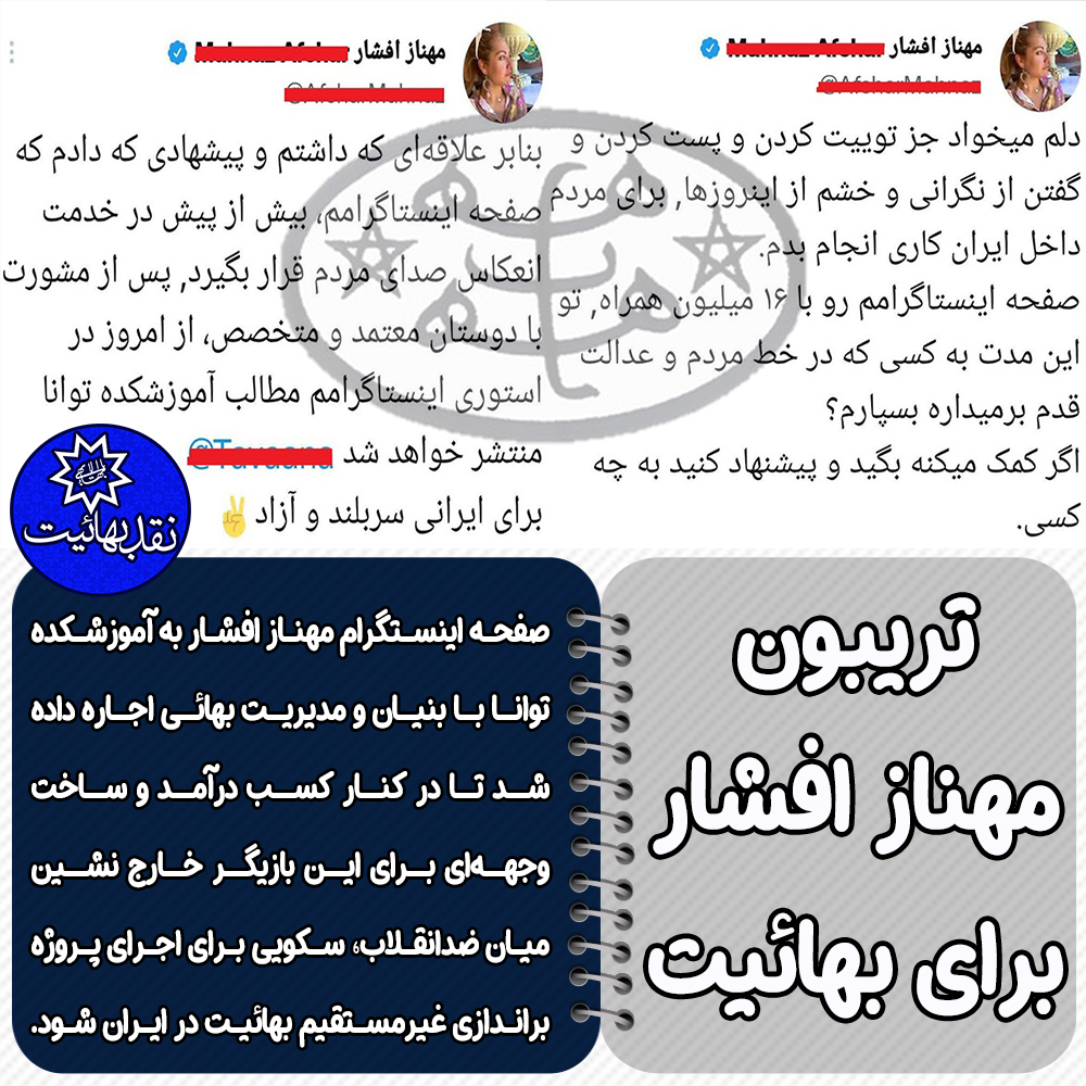 صفحه اینستگرام مهناز افشار به آموزشکده توانا با بنیان و مدیریت بهائی اجاره داده شد تا در کنار کسب درآمد و ساخت وجههای برای این بازیگر خارج نشین میان ضدانقلاب، سکویی برای اجرای پروژه براندازی غیرمستقیم بهائیت در ایران شود.