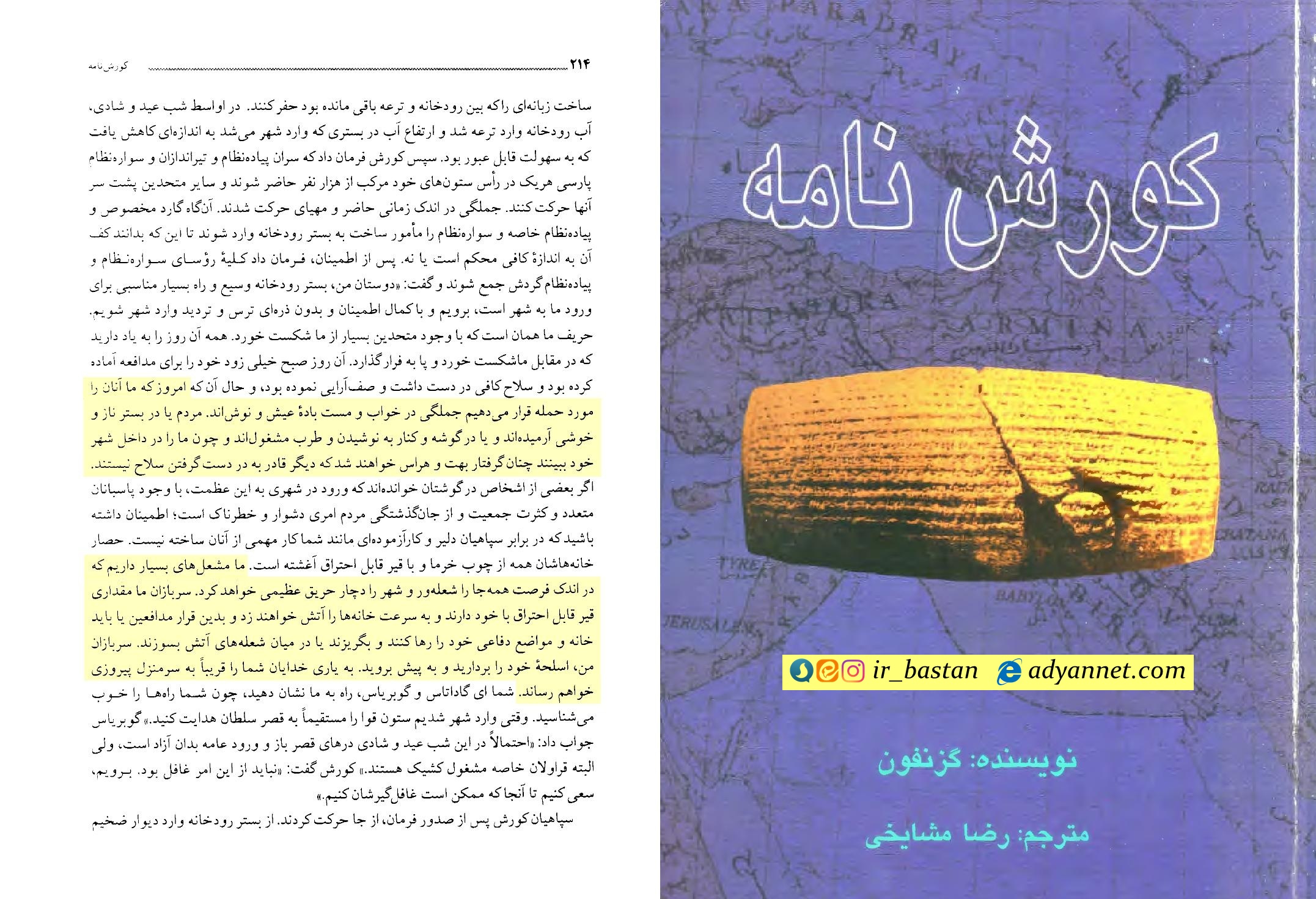 گزنفون، کوروش نامه، ترجمه رضا مشایخی، تهران: انتشارات علمی و فرهنگی، 1384، ص 214.