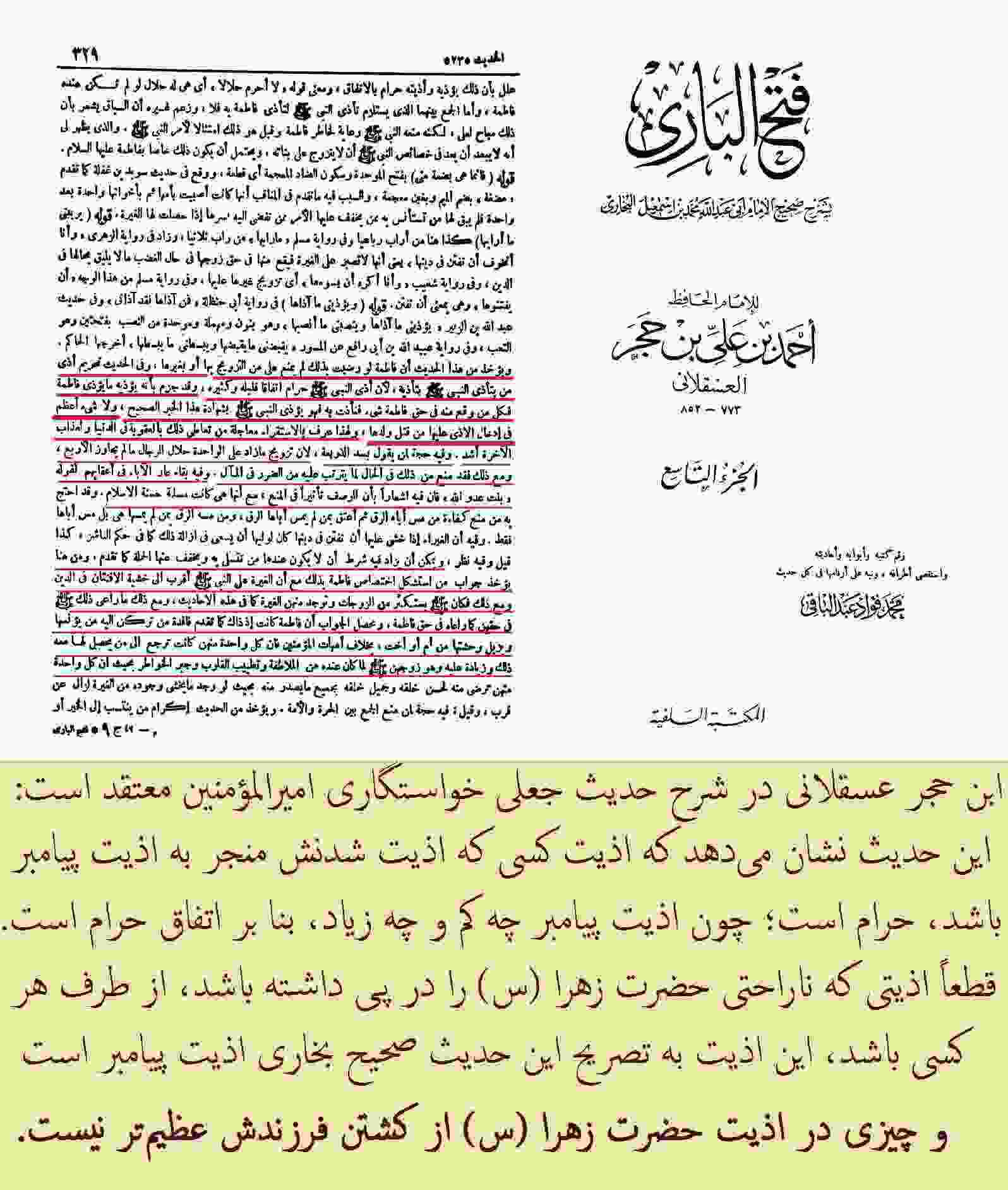 [1]. پیامبر صلیاللهعلیهوآله فرمود: «فاطمه سلاماللهعليها پاره تن من است، کسی او را اذیت کند، مرا اذیت کرده است». خداوند میفرماید: «آنهايی كه خدا و پيامبرش را اذيت كنند، در دنيا و آخرت مورد لعن خداوند قرار گرفته و برای آنان عذاب خوار كنندهای آماده شده است» و حضرت زهرا سلاماللهعليها به علت اذیتهایی که از طرف خلفا بر او رفت، نسبت به آنان غضب کرد و تا آخر عمر بر این غضب خود باقی ماند.