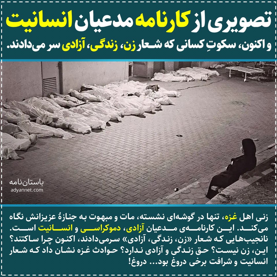 زنی اهل غزه، تنها در گوشهای نشسته، مات و مبهوت به جنازۀ عزیزانش نگاه میکند. این کارنامهی مدعیان آزادی، دموکراسی و انسانیت است. نانجیبهایی که شعار «زن، زندگی، آزادی» سرمیدادند، اکنون چرا ساکتند؟ این، زن نیست؟ حق زندگی و آزادی ندارد؟ حوادث غزه نشان داد که شعار انسانیت و شرافت برخی دروغ بود... دروغ!