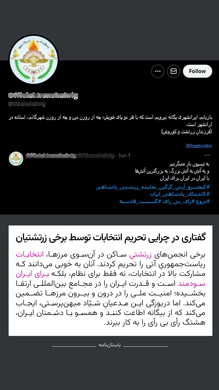 برخی انجمنهای زرتشتیِ ساکن در آنسوی مرزها، انتخابات ریاستجمهوریِ آتی را تحریم کردند. آنان به خوبی میدانند که مشارکت بالا در انتخابات، نه فقط برای نظام، بلکه برای ایران سودمند است و قدرت ایران را در مجامع بینالمللی ارتقا بخشیده؛ امنیت ملی را در درون و بیرون مرزها تضمین میکند. اما دریوزگی این مدعیانِ شیّاد میهنپرستی، ایجاب میکند که از بیگانه اطاعت کنند و همسو با دشمنان ایران، هشتگ رأی بی رأی را به کار ببرند.