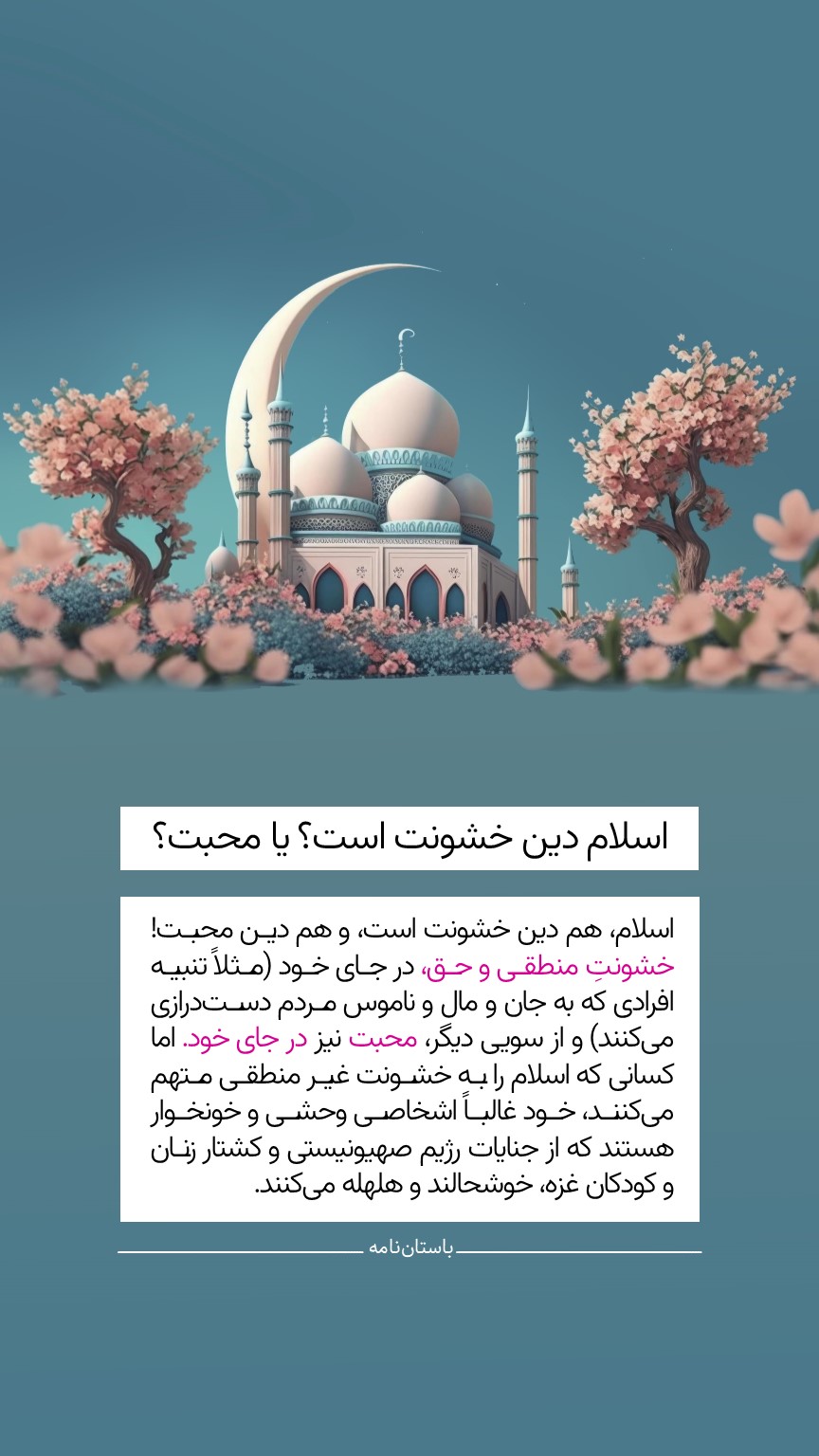 اسلام، هم دین خشونت است، و هم دین محبت! خشونت منطقی و حق، در جای خود (مثلاً تنبیه افرادی که به جان و مال و ناموس مردم دستدرازی میکنند) و از سویی دیگر، محبت نیز در جای خود. اما کسانی که اسلام را به خشونت غیر منطقی متهم میکنند، خود غالباً اشخاصی وحشی و خونخوار هستند که از جنایات رژیم صهیونیستی و کشتار زنان و کودکان غزه، خوشحالند و هلهله میکنند.