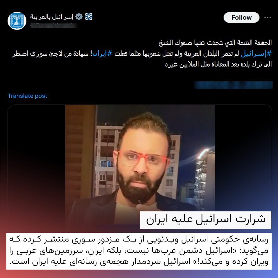 رسانهی حکومتی اسرائیل ویدئویی از یک مزدور سوری منتشر کرده که میگوید: «اسرائیل دشمن عربها نیست، بلکه ایران، سرزمینهای عربی را ویران کرده و میکند!» اسرائیل سردمدار هجمهی رسانهای علیه ایران است.