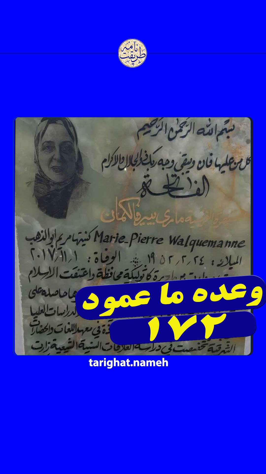 پایگاه جامع فرق، ادیان و مذاهب_ دفن اسلام شناس فرانسوی در مسیر پیادهروی زائران اربعین: اسلام شناس مسلمان فرانسوی، خانم «ماری پیر والکمان» پس از مسلمان شدن، نام «مریم ابوالذهب» را برای خود برگزیده است؛ وی چند بار به زیارت عتبات عالیات مشرف شد و وصیّت کرد پس از مرگش، در مسیر زائران اربعین دفن شود. بنا به وصیت نامهاش در صحن مطهرعلوی تشییع شد و در حسینیهای در جاده نجف - کربلا، در نزدیکی عمود شماره 172 دفن شده است.