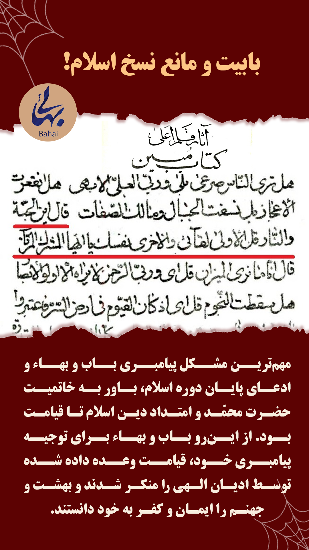مهمترین مشکل پیامبری باب و بهاء و ادعای پایان دوره اسلام، باور به خاتمیت حضرت محمّد و امتداد دین اسلام تا قیامت بود. از اینرو باب و بهاء برای توجیه پیامبری خود، قیامت وعده داده شده توسط ادیان الهی را منکر شدند و بهشت و جهنم را ایمان و کفر به خود دانستند.