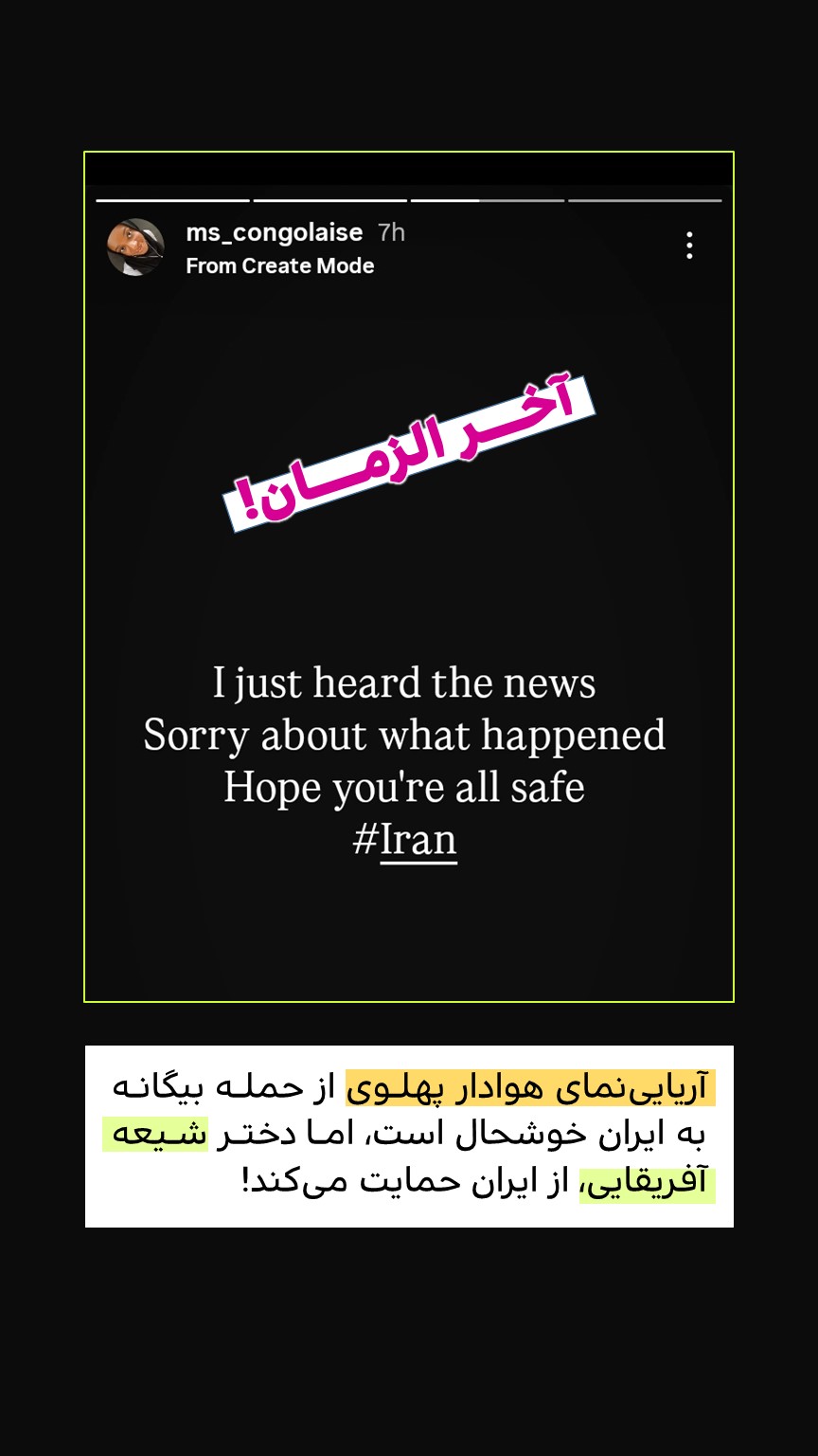 آریایینمای هوادار پهلوی از حمله بیگانه به ایران خوشحال است، اما دختر شیعه آفریقایی، از ایران حمایت میکند!